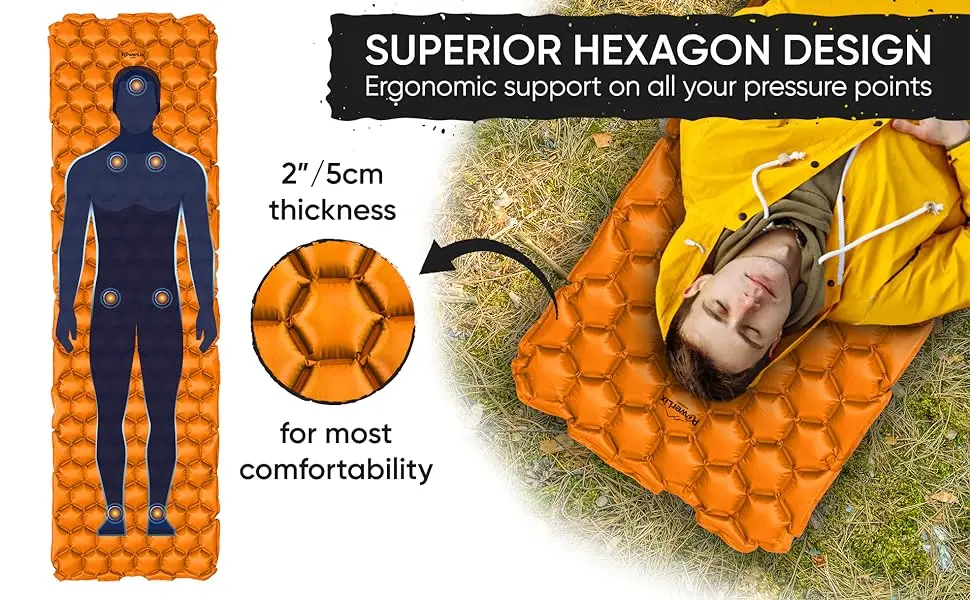 REJUVENATE YOUR BODY: camping pad has revolutionary hexagon design made with body mapping technology. The hexagon air cells ergonomically support all of your pressure points, giving you superior support and comfort all night long, no matter how you sleep! The sleeping mat is also a camping gear must haves luxury, being comfortable yet lightweight. It rolls up small, making it effortless to carry around. The cot comes in a variety of color choices, sure to match anyone’s personality.